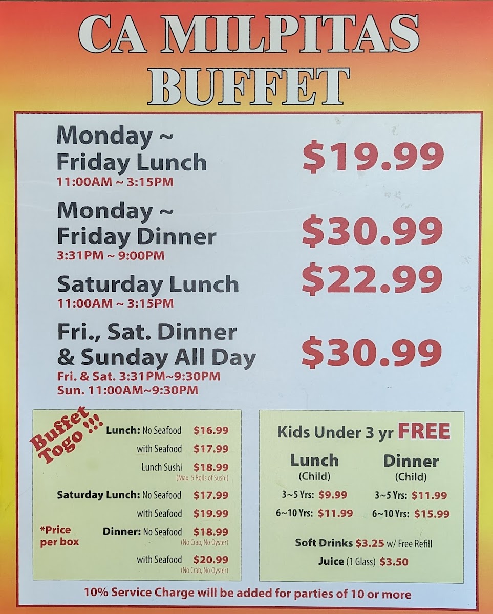 The menu at Milpitas Buffet offers a relaxed and approachable dining experience, centered around a wide selection of Chinese cuisine and fresh seafood in an all-you-can-eat format. It’s the kind of place where you can explore a variety of flavors at your own pace, whether you’re stopping by for a casual lunch or settling in for a leisurely dinner with family and friends.